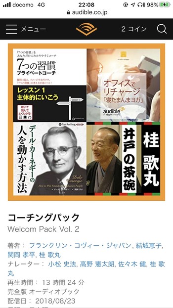 月額費用の変わりにAudible内で好きな本と交換できるコインが1枚、アカウントに付与されるというシステムです。